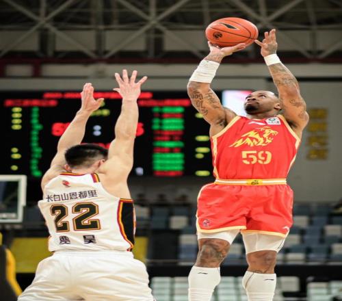 3月18日,浙江浙商证券队球员雷琼·塔克(右)在比赛中投篮。新华社记者 江汉 摄