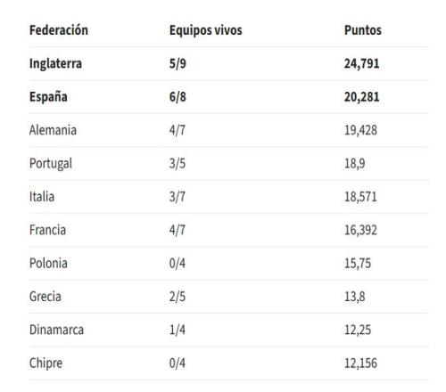 至于英格兰,虽然欧冠一下子折损了三员大将,但他们之前的底子太厚,总积分高达24.791,完全可以高枕无忧。他们在小组赛阶段表现强势,有五支球队进入欧冠前八,加上维拉在欧联杯的高歌猛进,直接把分数拉开了。